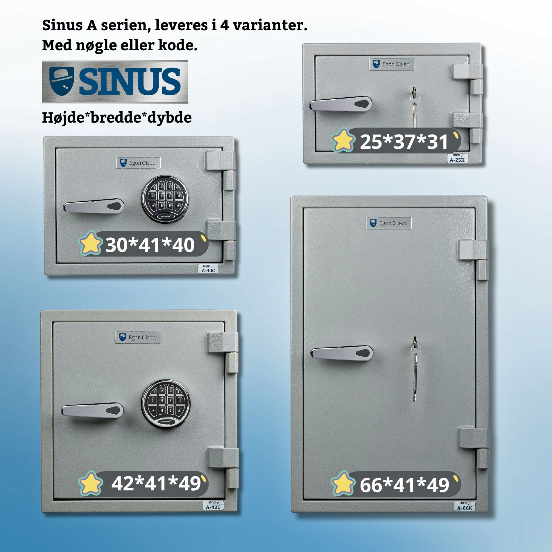Opdag den nye serie SINUS pengeskabe fra Egon Olsen Pengeskabe – din fagmand inden for sikre og pålidelige opbevaringsløsninger. Med et stilrent nordisk design kombineret med en robust og gennemtestet konstruktion, får du et pengeskab, der både beskytter dine værdier og passer ind i moderne omgivelser.