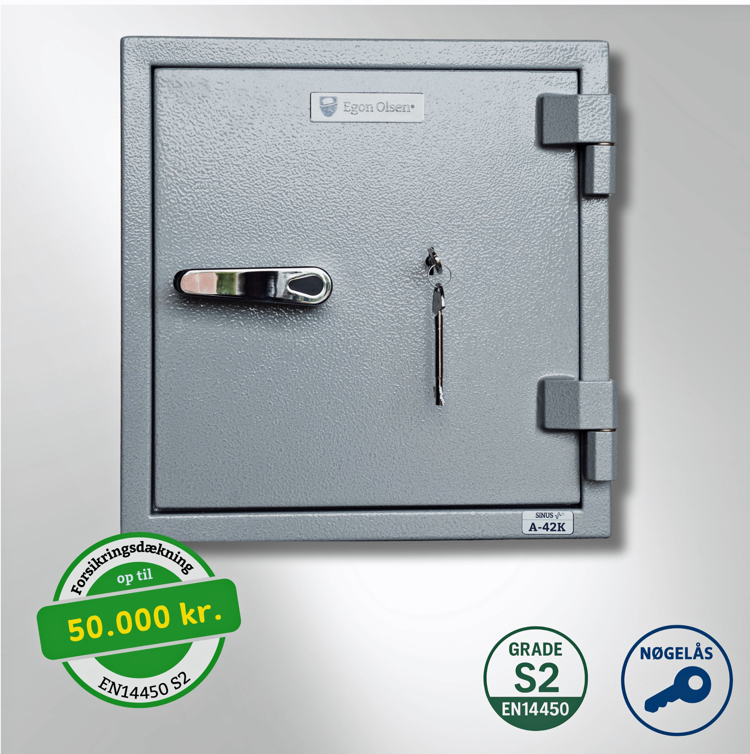 Et Egon Olsen pengeskab, der er certificeret efter EN 14450 S2 ECB‑S‑testet værdiopbevaringsenhed registreret under Dansk sikringsregulativ kan normalt forsikres for op til 50.000 kr.