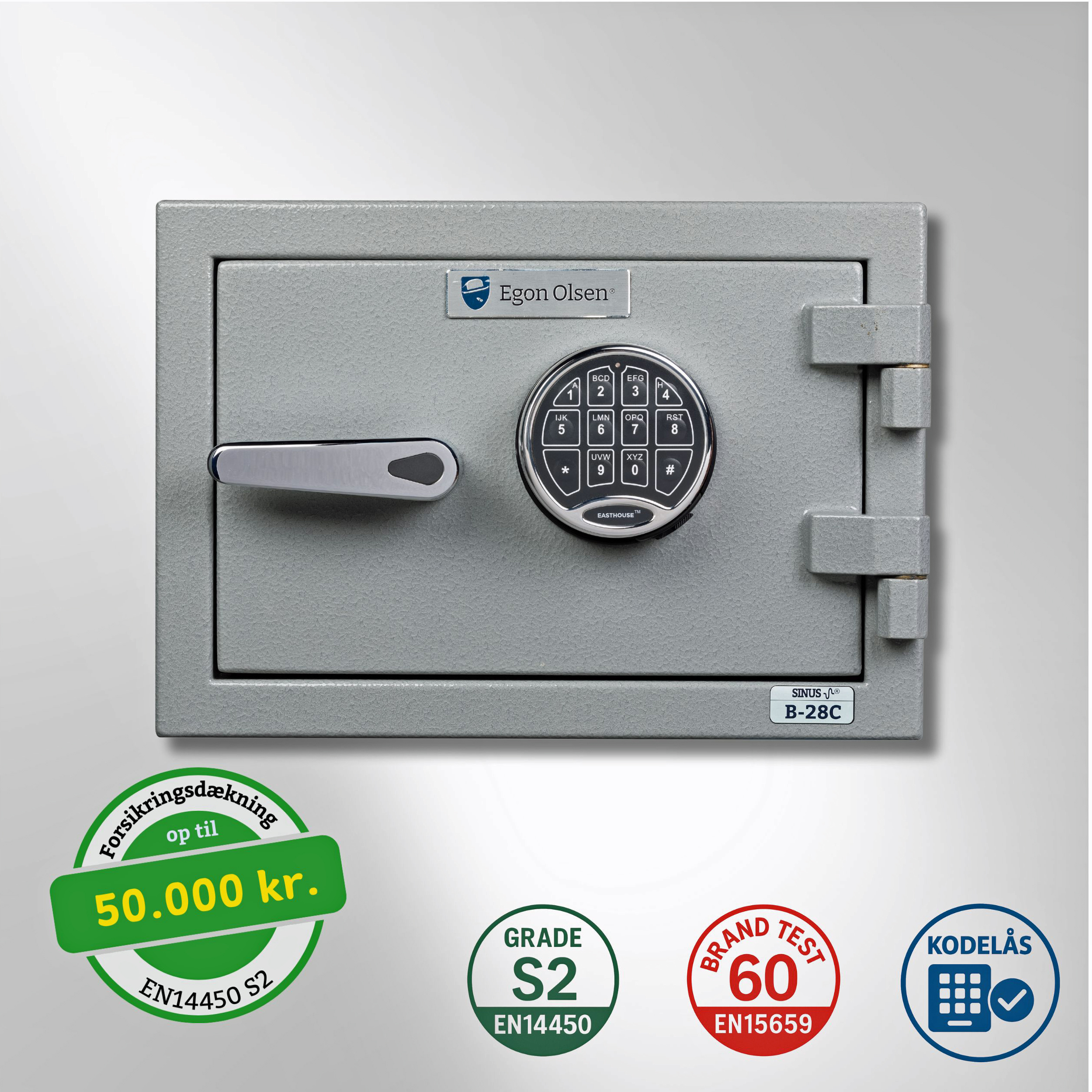 Et Egon Olsen pengeskab, der er certificeret efter EN 14450 S2 ECB‑S‑testet værdiopbevaringsenhed registreret under Dansk sikringsregulativ kan normalt forsikres for op til 50.000 kr.